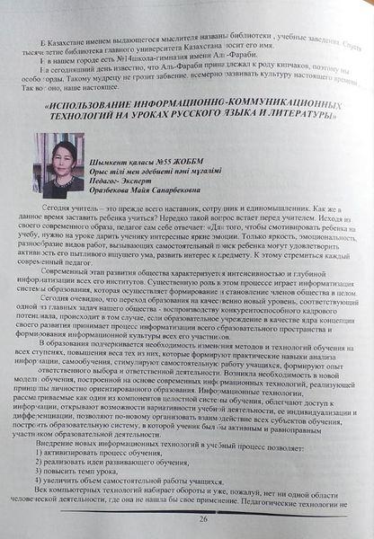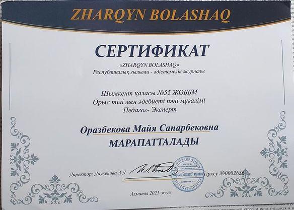 Шымкент қаласы №55 ЖОББМ-нің орыс тілі мен әдебиеті пәні мұғалімі, педагог-эксперт Оразбекова Майя Сапарбековнаның 2021 жылы Алматы қаласынан қазан айында шыққан «Жарқын болашақ» республикалық ғылыми-әдістемелік журналына «Использование информационно-коммуникационных технологий на уроках русского языка и литературы» тақырыбында мақаласы жарық көрді. Ол мақалада орыс тілі мен әдебиеті сабағында оқу-ақпараттық технологиялардың қолдану тәсілдерін жан-жақты, кең ауқымда қарастырған. Сонымен қоса № 0002636 тіркеу номерлі сертификатпен марапатталды.